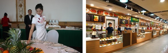 即以各地風味菜肴為主,品種達到50一60個,涼菜、熱菜、面食、粥、湯等均為明檔擺放。熱菜由廚房制作,擺入明檔。優勢在于集超市自選與餐飲現場制作為一體。顧客在選擇、觀看過程中完成取餐、進餐過程。